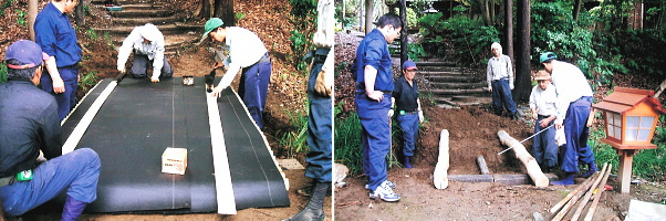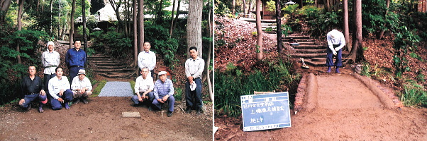 昨年の鉄砲垣の復元に引きつづき横浜マイスター大胡周一郎庭園部会長の指導のもと県域・地元青年部の皆さんの協力により7月17日(土)に金沢区にある旧川合玉堂別邸(二松庵)の古い土橋の撤去・土の掘り起こしなど泥だらけになりながら丹念に復元し有意義な体験講習会が行われた。